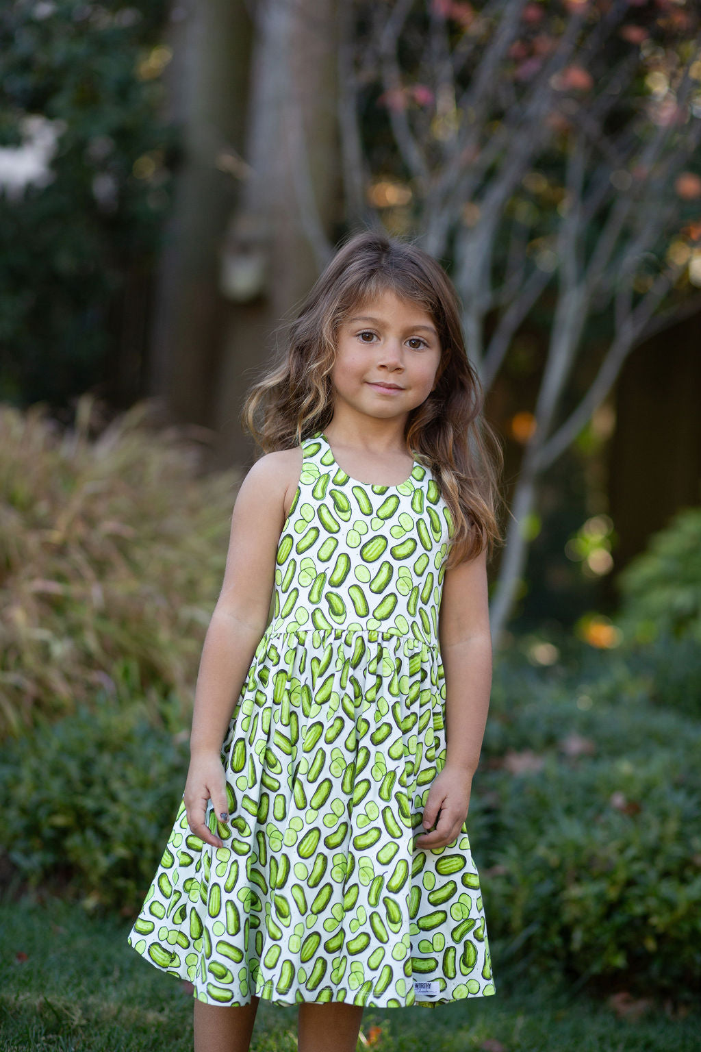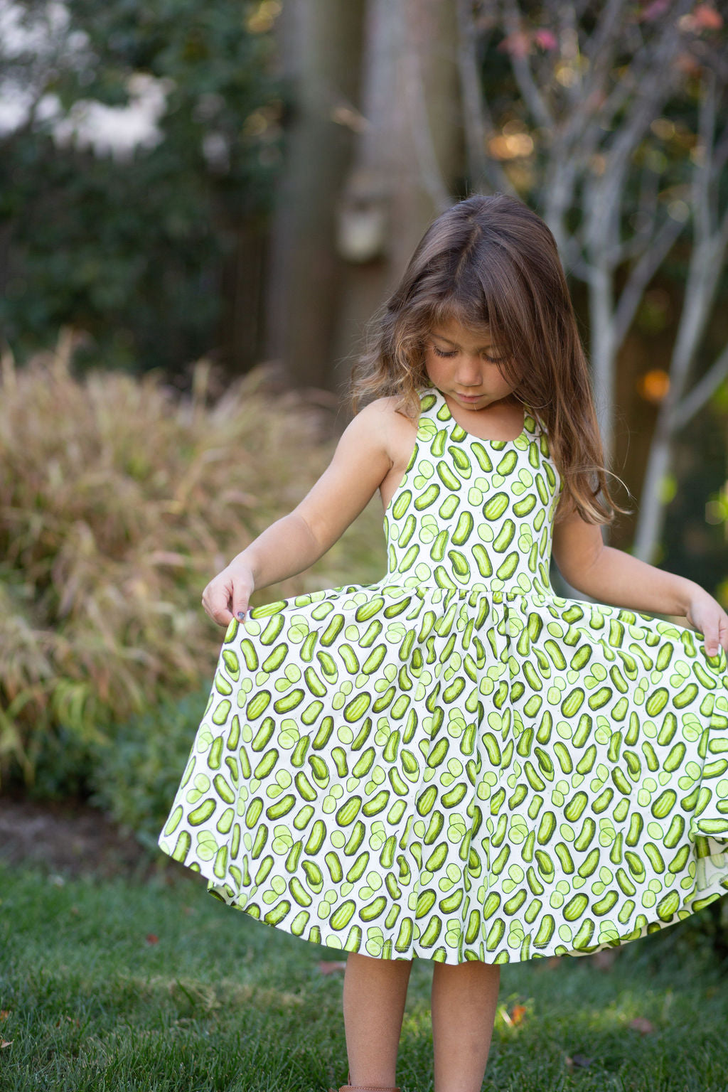 Our newest design is a knit pinafore style dress with cross back straps, and the twirl we all love.  Combined with our funky Pickles print, this is sure to be a summer favorite! AND it has pockets!