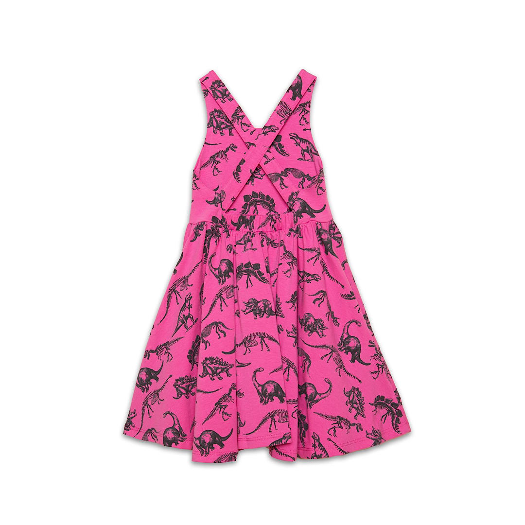 Our newest design is a knit pinafore style dress with cross back straps, and the twirl we all love.  Combined with our hot pink dinosaur print, this is sure to be a summer favorite! AND it has pockets!