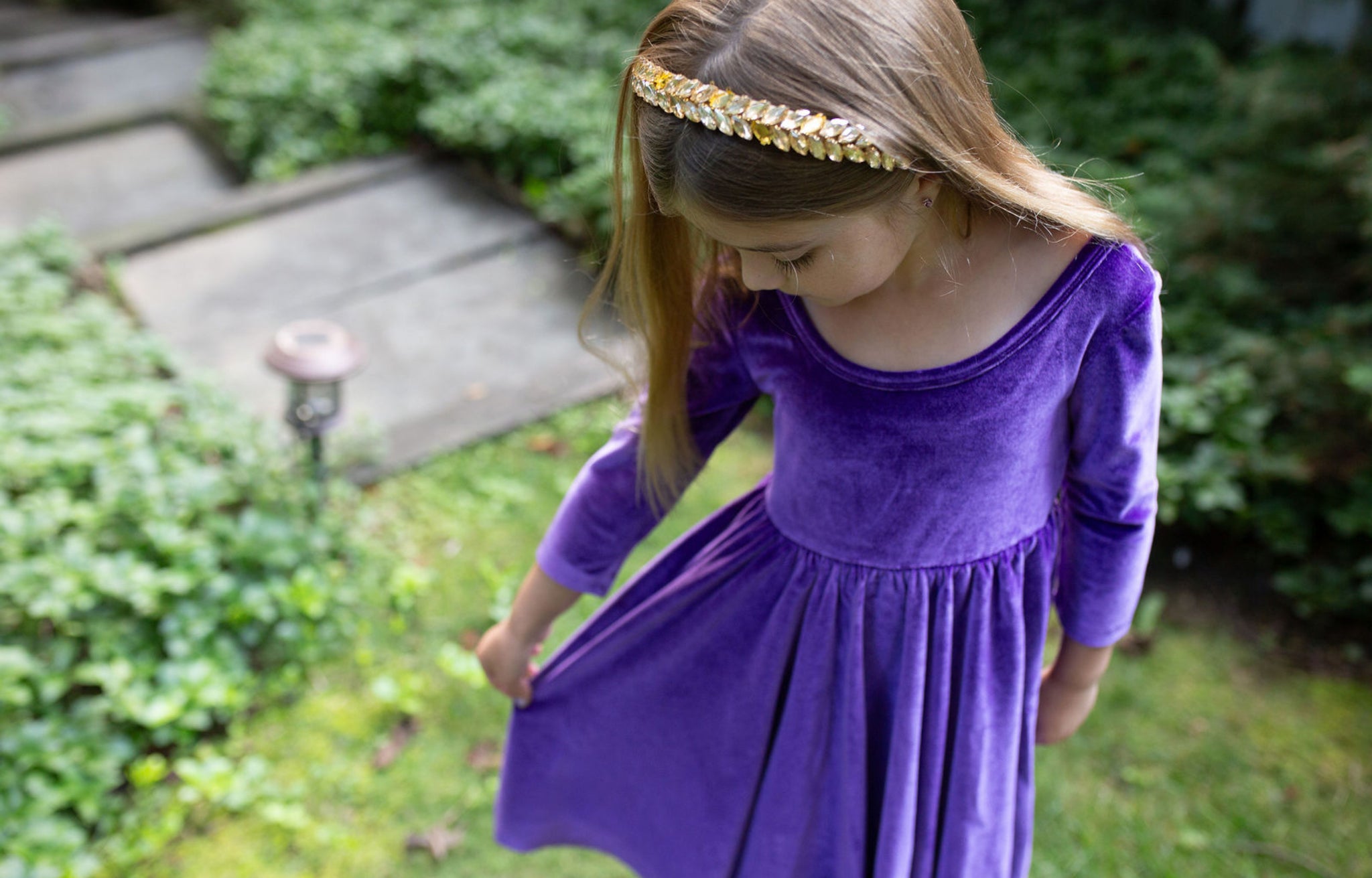 Our bestselling design is a girls knit dress with a scooped back and the perfect amount of twirl! This purple velvet twirly dress is elegant and comfortable