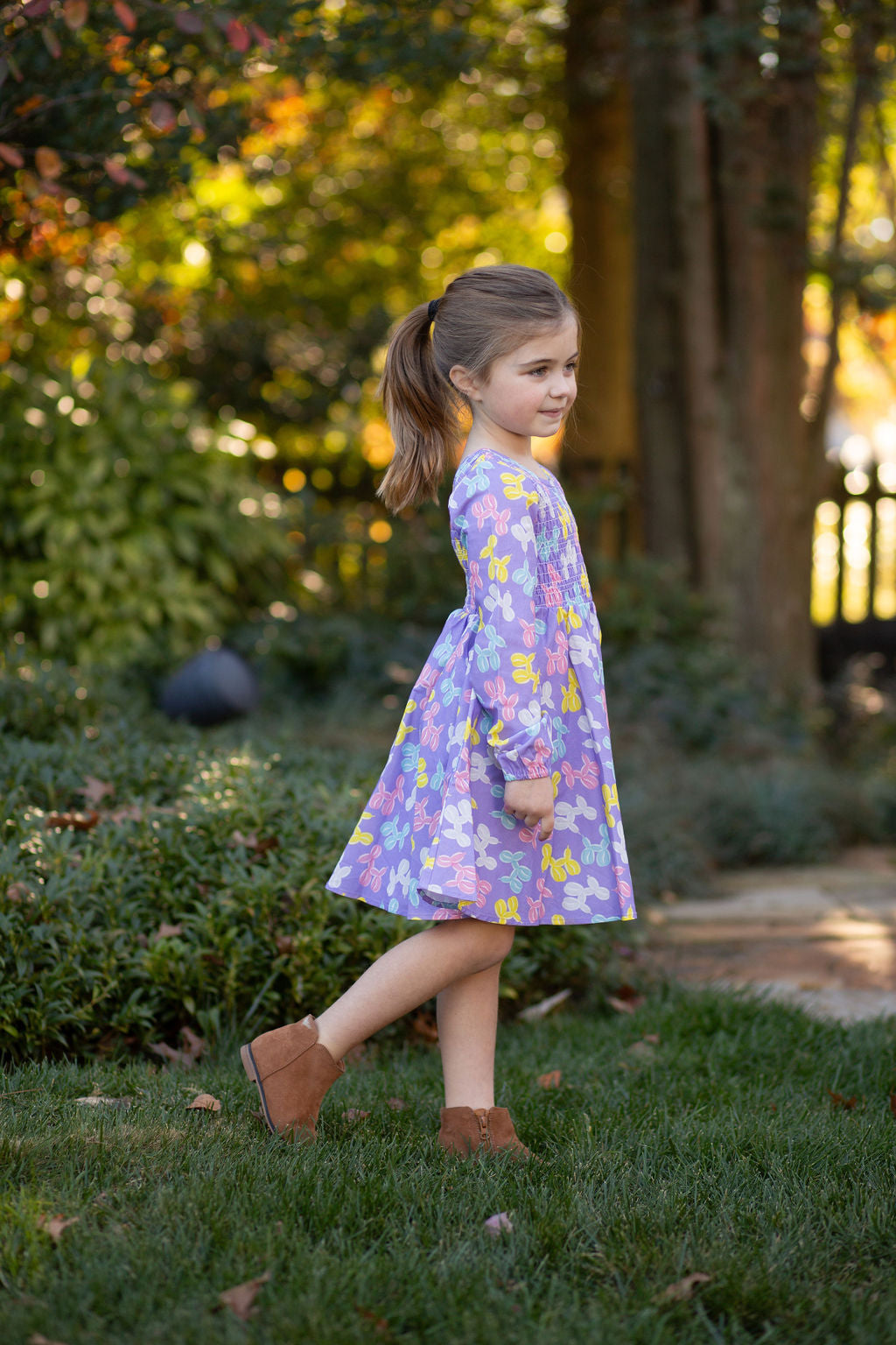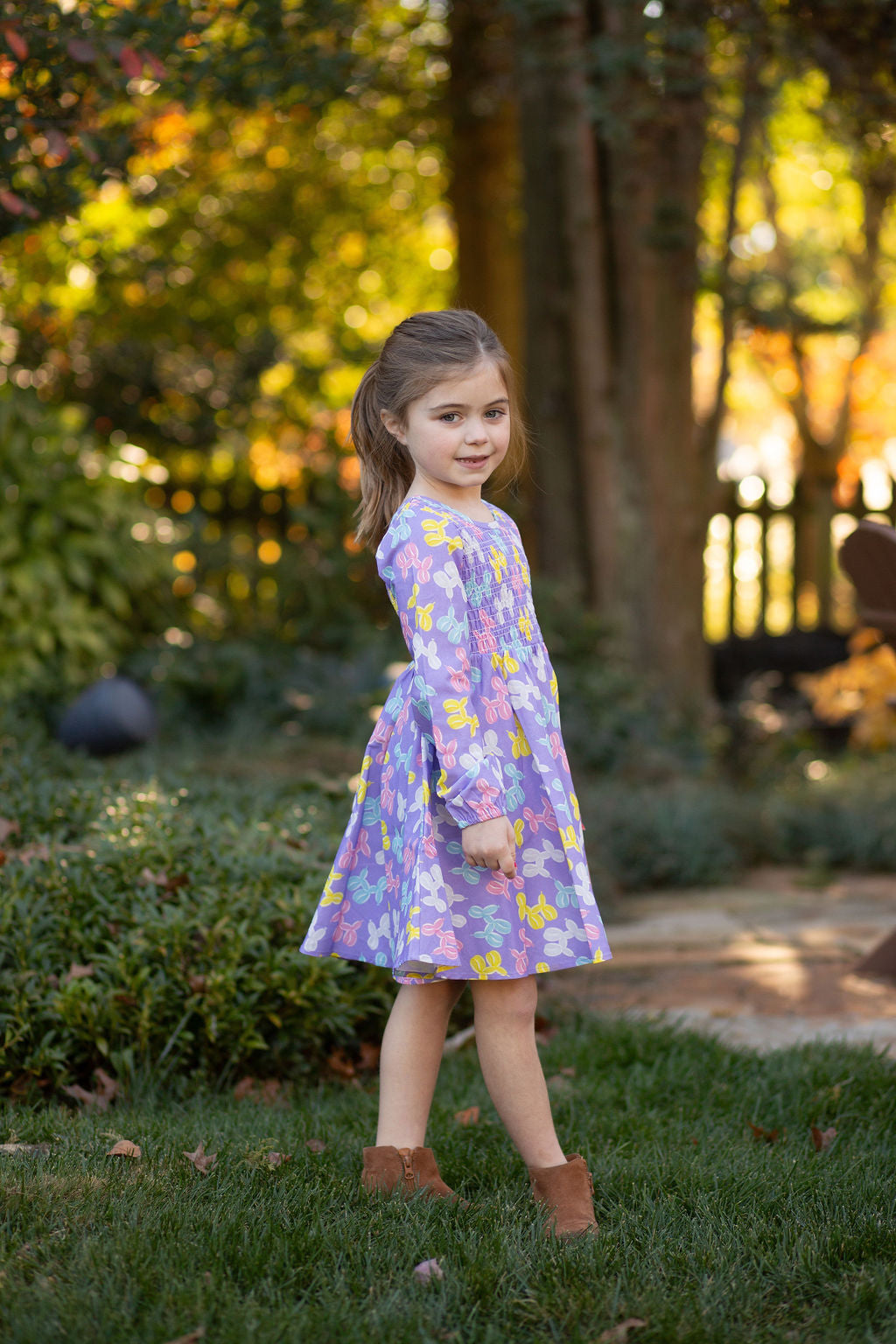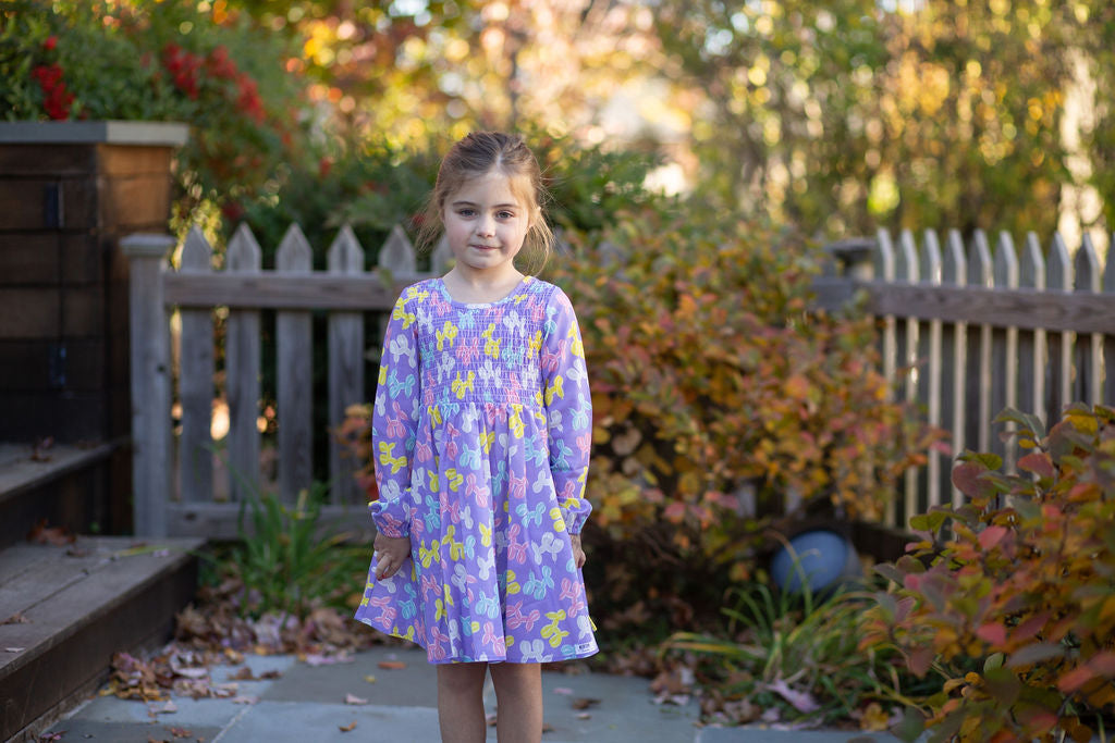 Our newest style is a long sleeved dress with a ruched bodice in the unique prints we are known for!